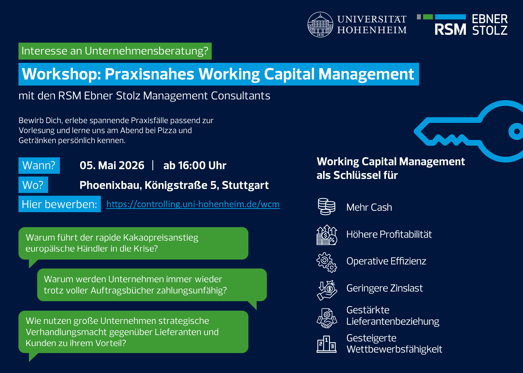 Haben wir Ihr Interesse geweckt? Dann freuen wir uns über Ihre formlose Anmeldung per E-Mail unter controlling@uni-hohenheim.de. Anmeldeschluss ist der 28.04.2026. Bitte fügen Sie Ihrer Anmeldung einen aktuellen Lebenslauf bei.